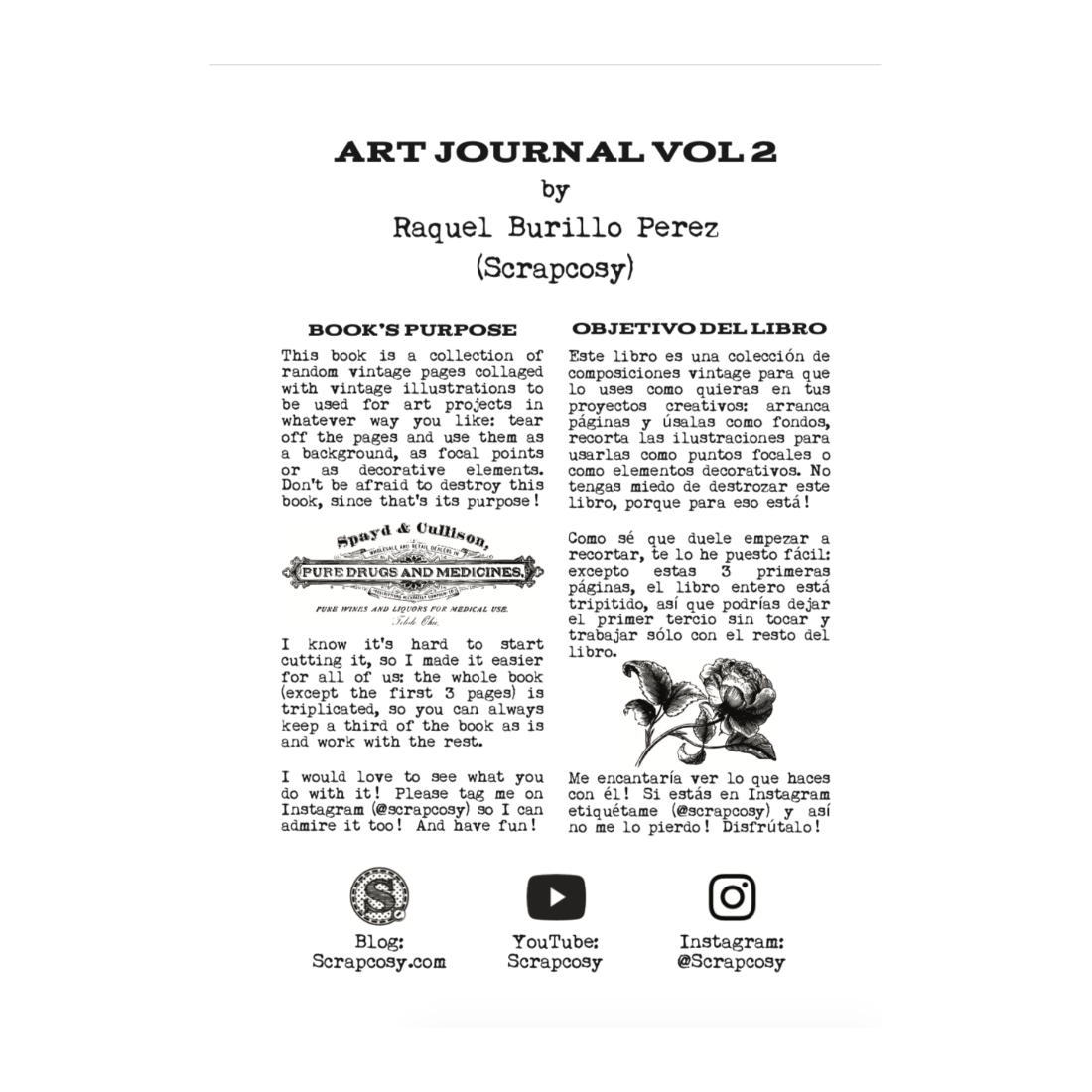 Art Journal Vol. 2 es el 2º libro de Raquel Burillo (@scrapcosy) y no está destinado a la lectura :) Se trata de una colección de páginas vintage en formato libro para que puedas recortar y utilizar para hacer collages
