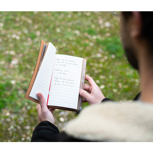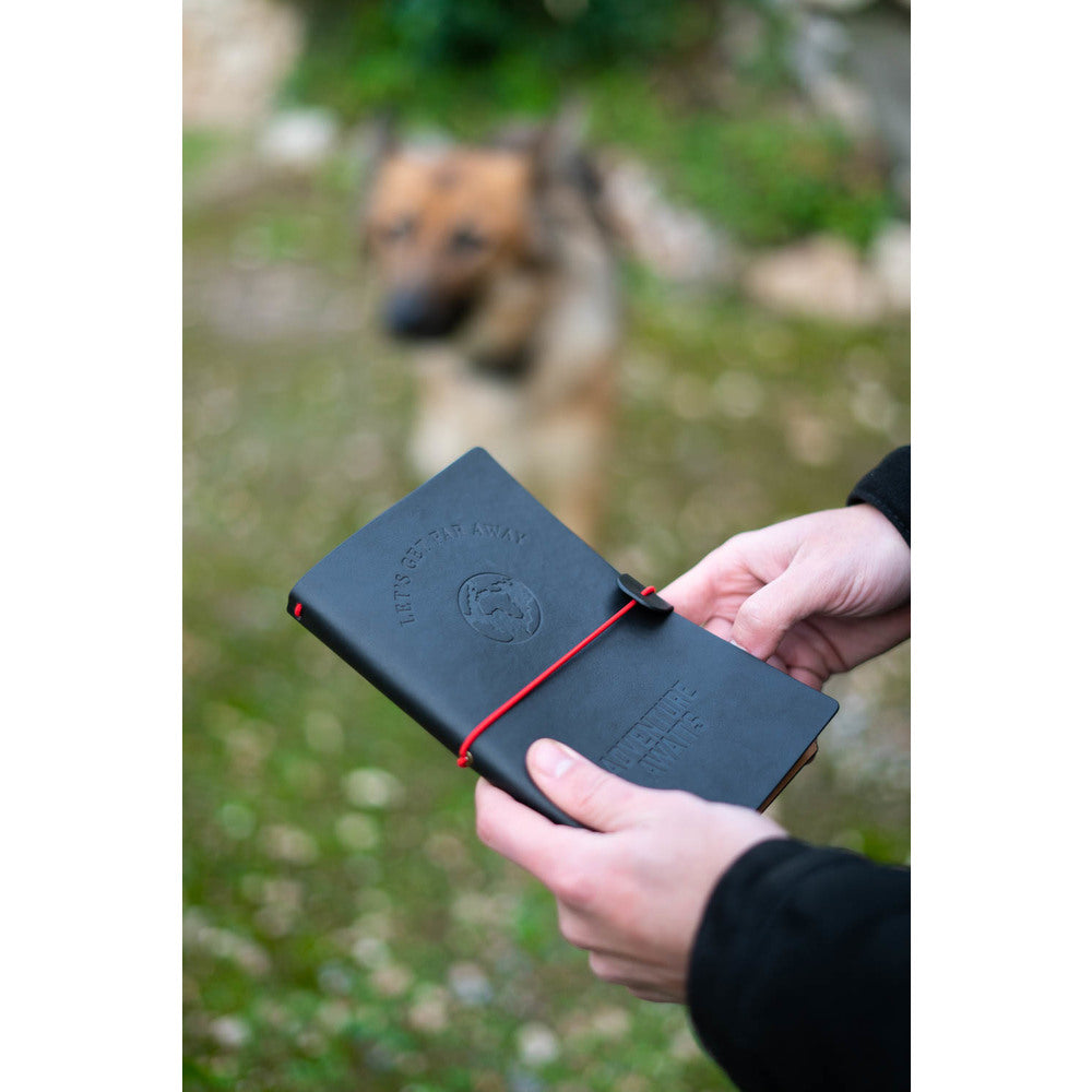 Cuaderno de viaje con tapa blanda de poliuretano. Incluye espacio para tarjetas, dos cuadernillos reemplazables con dos tipos de hoja diferentes (bullet y lineas) y un bolsillo en la parte interior trasera. Cuenta con una banda elástica y cierre de poliuretano. Las cubiertas tienen unas dimensiones de 12 x 19,5 cm y el interior presenta unas medidas de 10,5 x 18,5 cm.