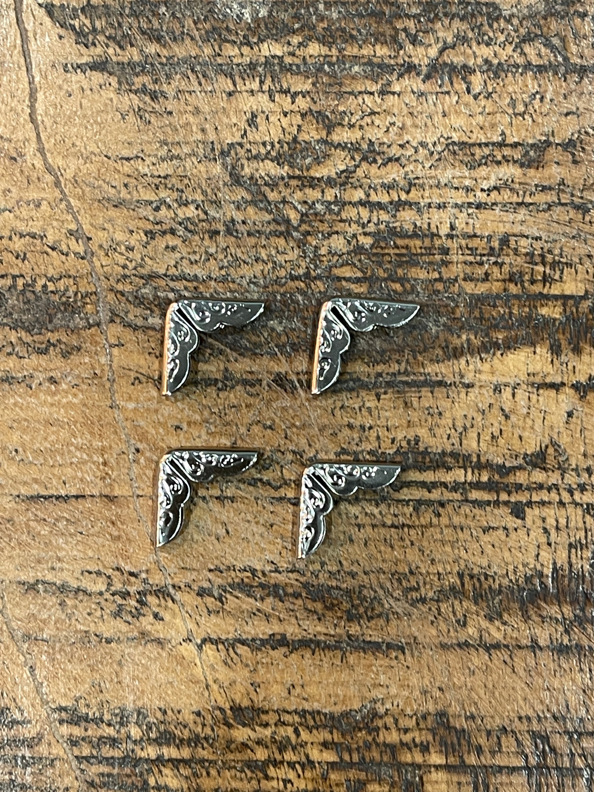 Cantoneras metálicas con grabado de filigrana, para proteger las esquinas de las carpetas de cartón. Ideales para tus trabajos de Scrapbook.